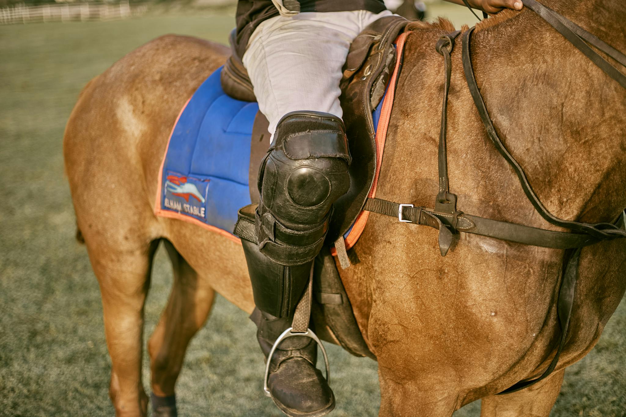 Polo player seated on horse, showing leg guard and saddle details.Everest Series